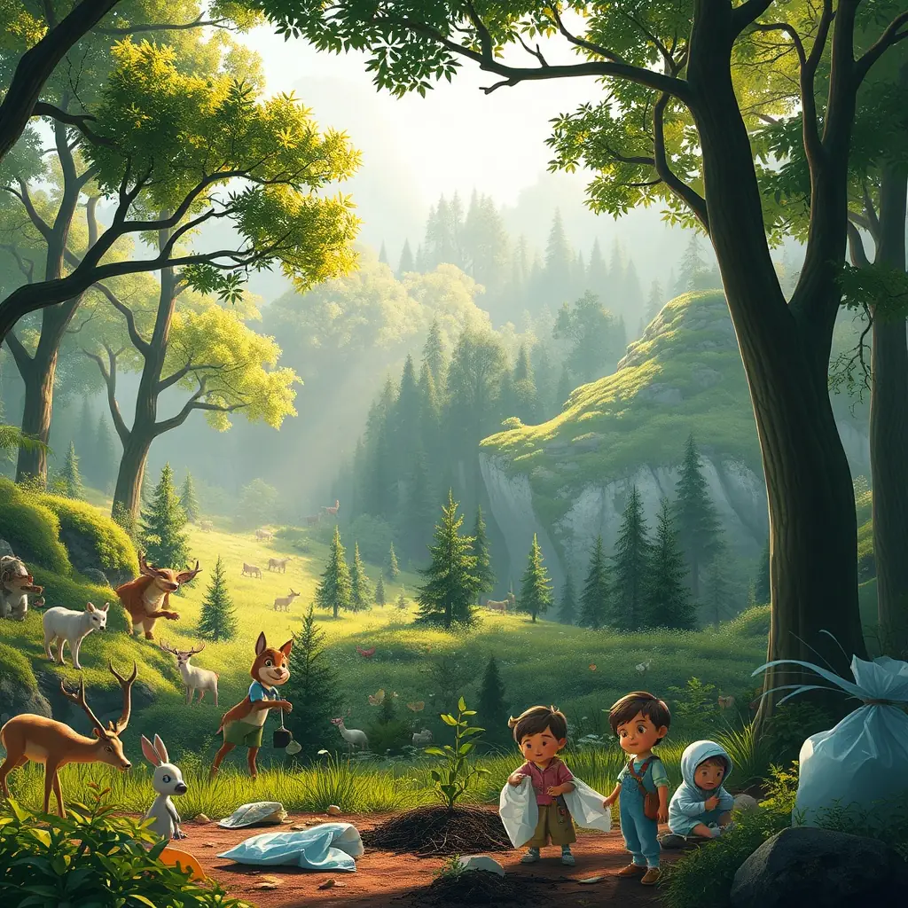 A group of children participating in a nature walk, led by a knowledgeable guide who is pointing out different plant and animal species. The image should evoke a sense of wonder and appreciation for the natural world.