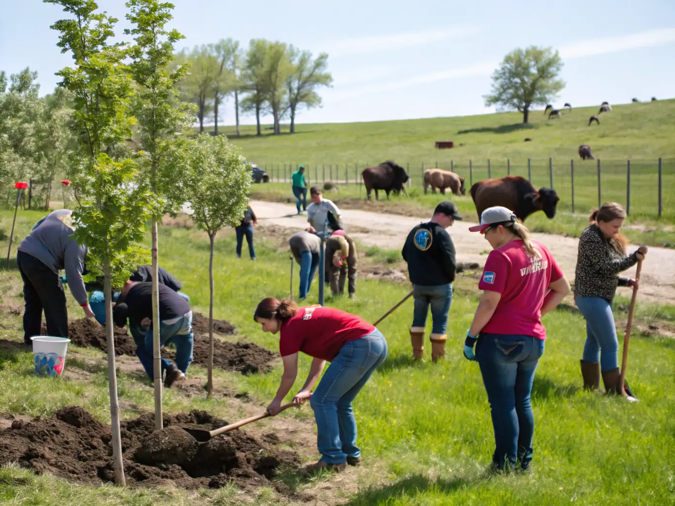 A group of volunteers participating in a habitat restoration project, planting native trees and shrubs in a deforested area. The image should convey a sense of community involvement and environmental stewardship.